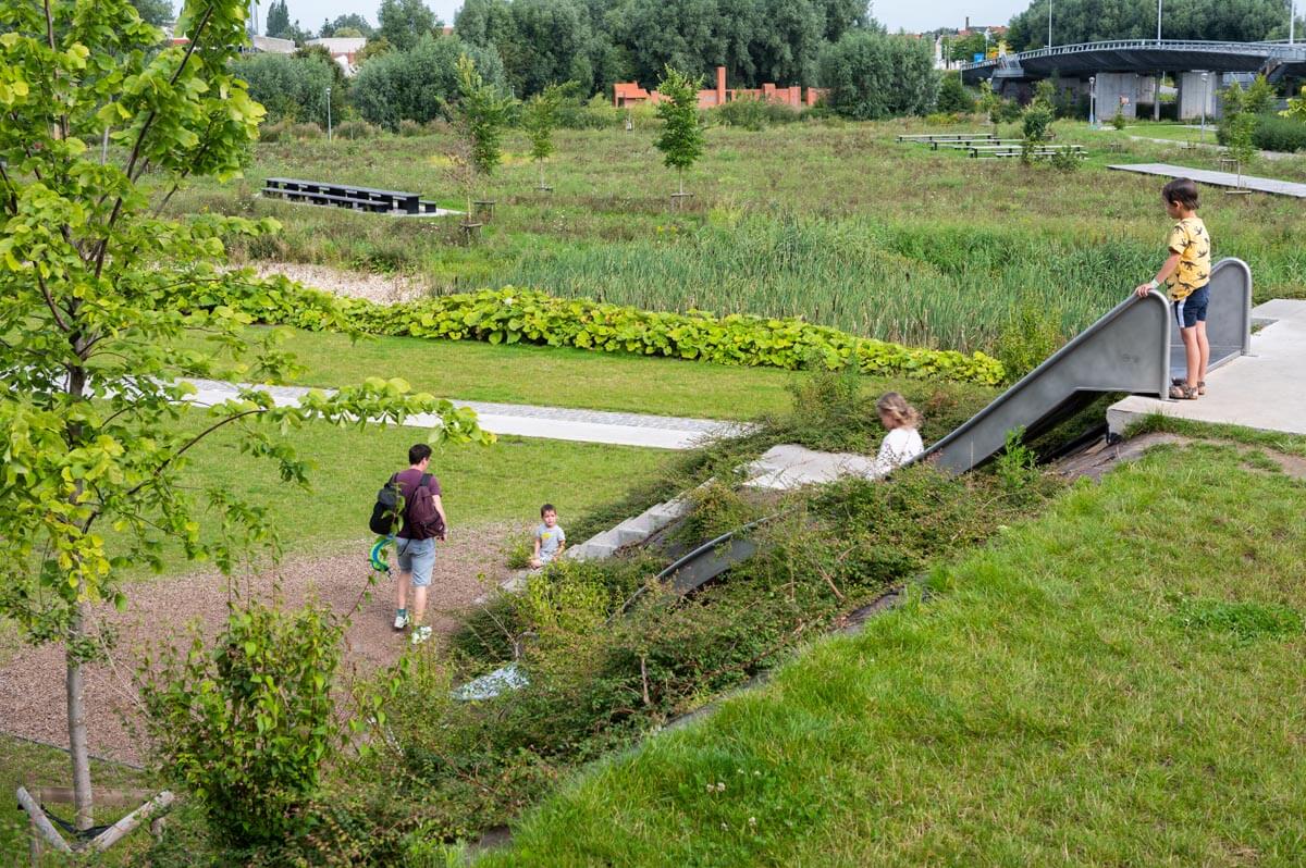 The structure of the water garden, which also serves as a water buffer, an infiltration zone and a splash & play zone, is an example of elements with their specific character that are integrated in the park. Moreover the use and functions are multifunctional. Furthermore there are a nut garden, a reed border along the Lys, diverse resting spots with e.g. a barbecue area. Overall, this creates a varied program of possibilities and opportunities.